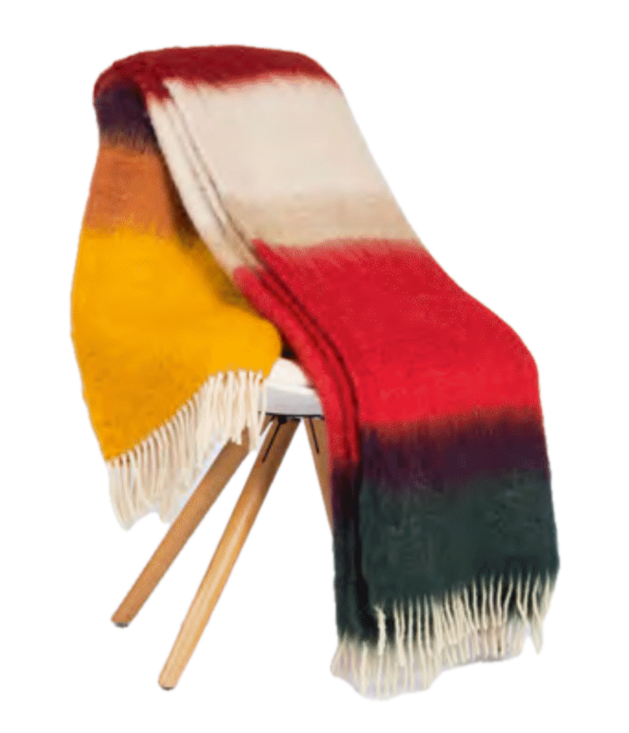 Matisse blanket with Mohair weft and Mohair-Wool warp and fringe. Made of 50% Mohair, 48% Wool and 2% Polyamide. Measures 51×79 inches. It includes the following color combination: Red, Honey Yellow, burgandy, cream and Emerald Green.Dry Clean only. Brush with a hard clothes-brush in the direction of the nap. Made in Spain.